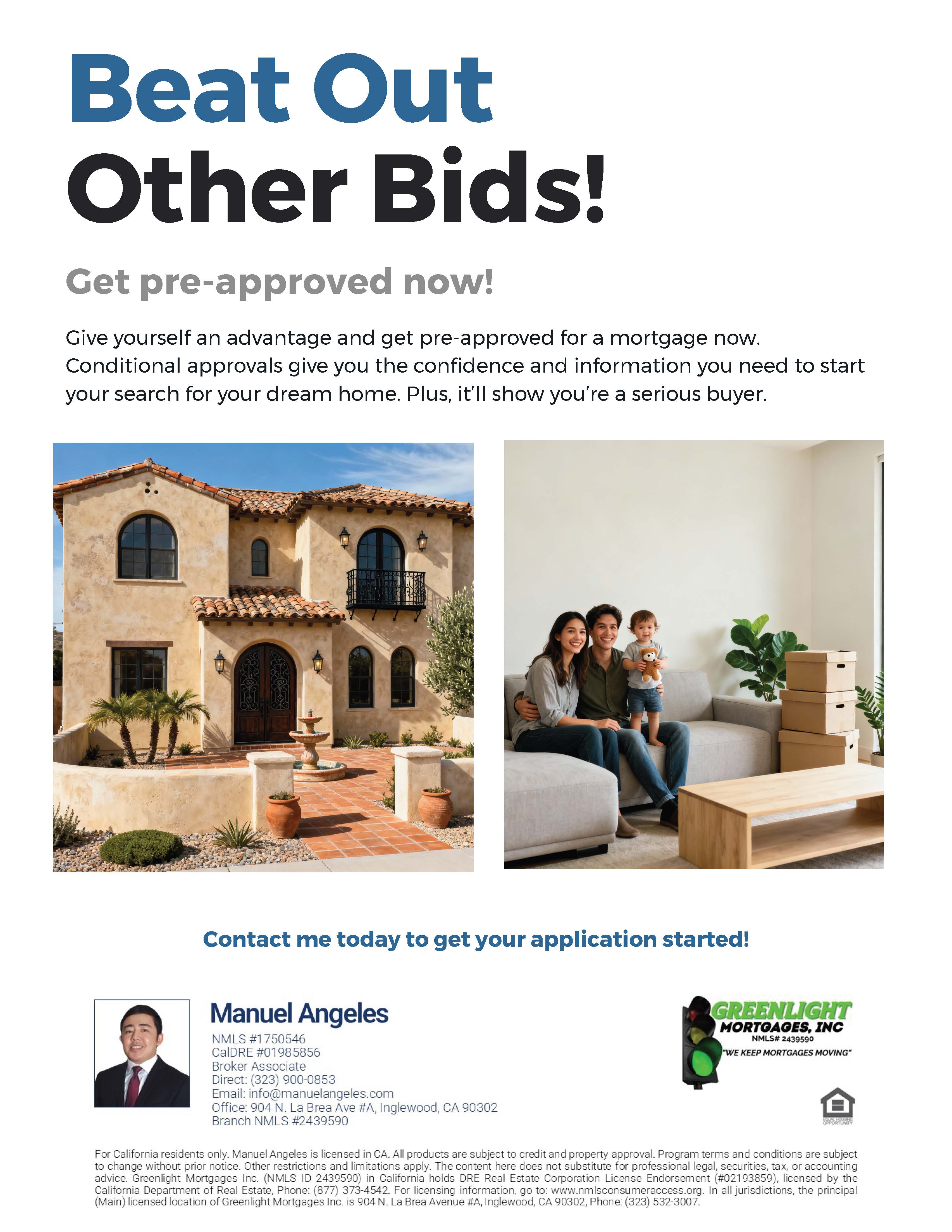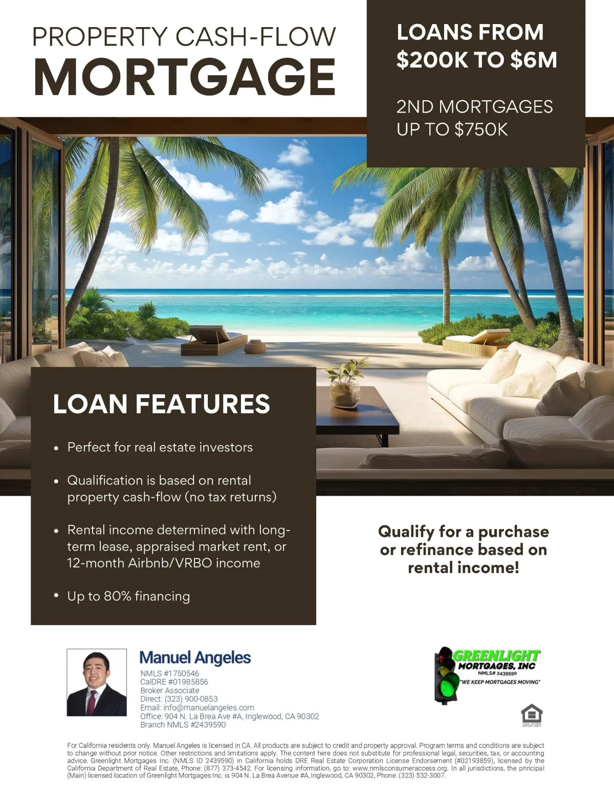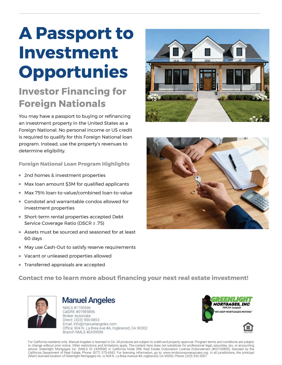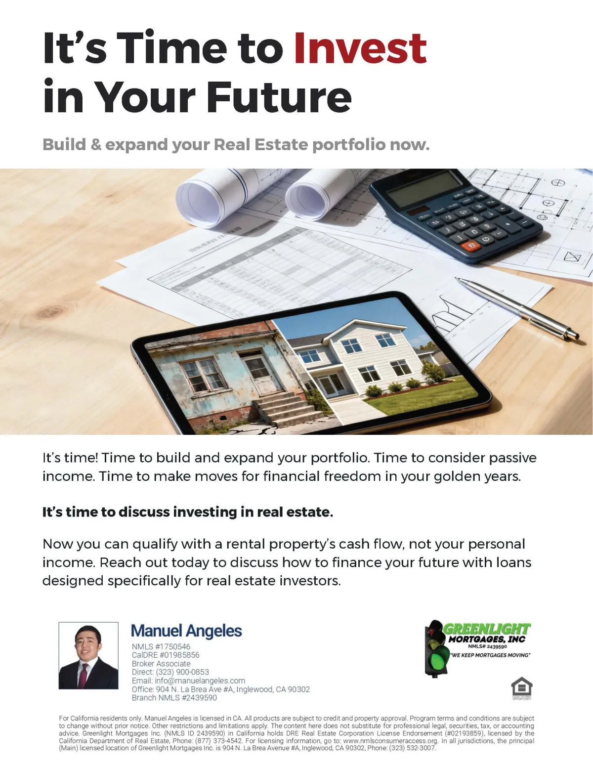 For California residents only. Manuel Angeles is licensed in CA. All products are subject to credit and property approval. Program terms and conditions are subject to change without prior notice. Other restrictions and limitations apply. The content here does not substitute for professional legal, securities, tax, or accounting advice. Greenlight Mortgages Inc. (NMLS ID 2439590) in California holds DRE Real Estate Corporation License Endorsement (#02193859), licensed by the California Department of Real Estate, Phone: (877) 373-4542. For licensing information, go to: www.nmlsconsumeraccess.org. In all jurisdictions, the principal (Main) licensed location of Greenlight Mortgages Inc. is 904 N. La Brea Avenue #C, Inglewood, CA 90302, Phone: (323) 532-3007. Non-owner-occupied business purpose investment residential and commercial property loans are available in AL, AR, CA, CO, CT, DE, DC, GA, HI, IL, IN, IA, KS, KY, LA, ME, MD, MA, MS, MO, NE, NH, NM, NY, OH, OK, PA, RI, SC, TX, VT, WA, WV, WI, WY.