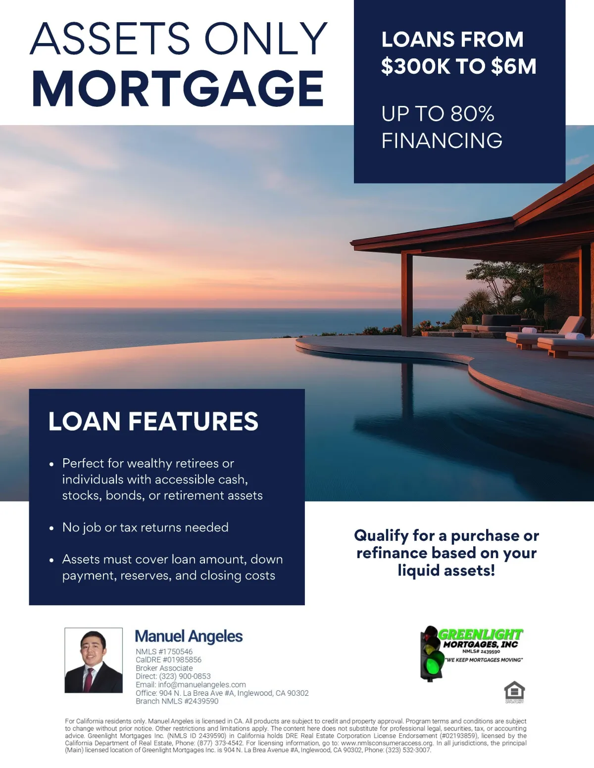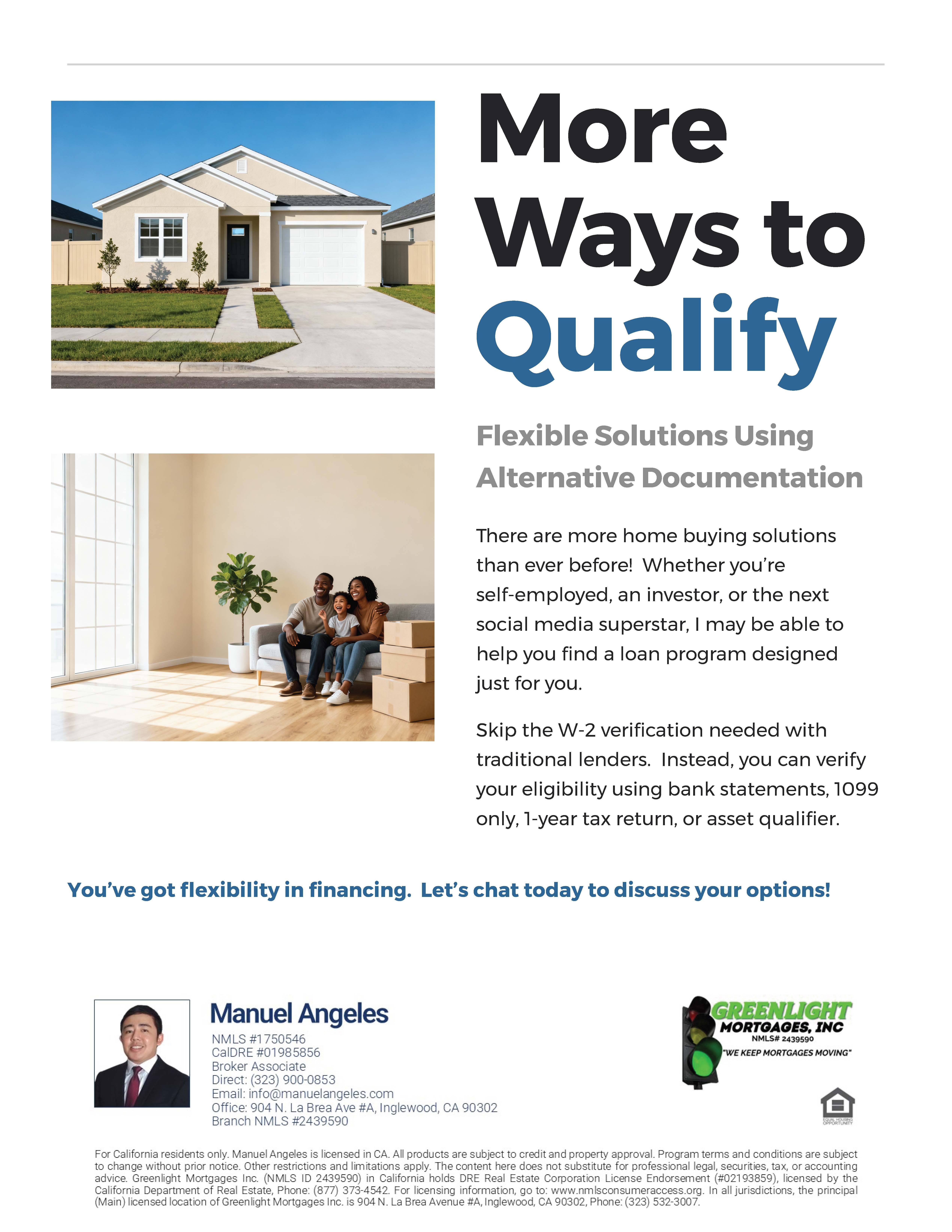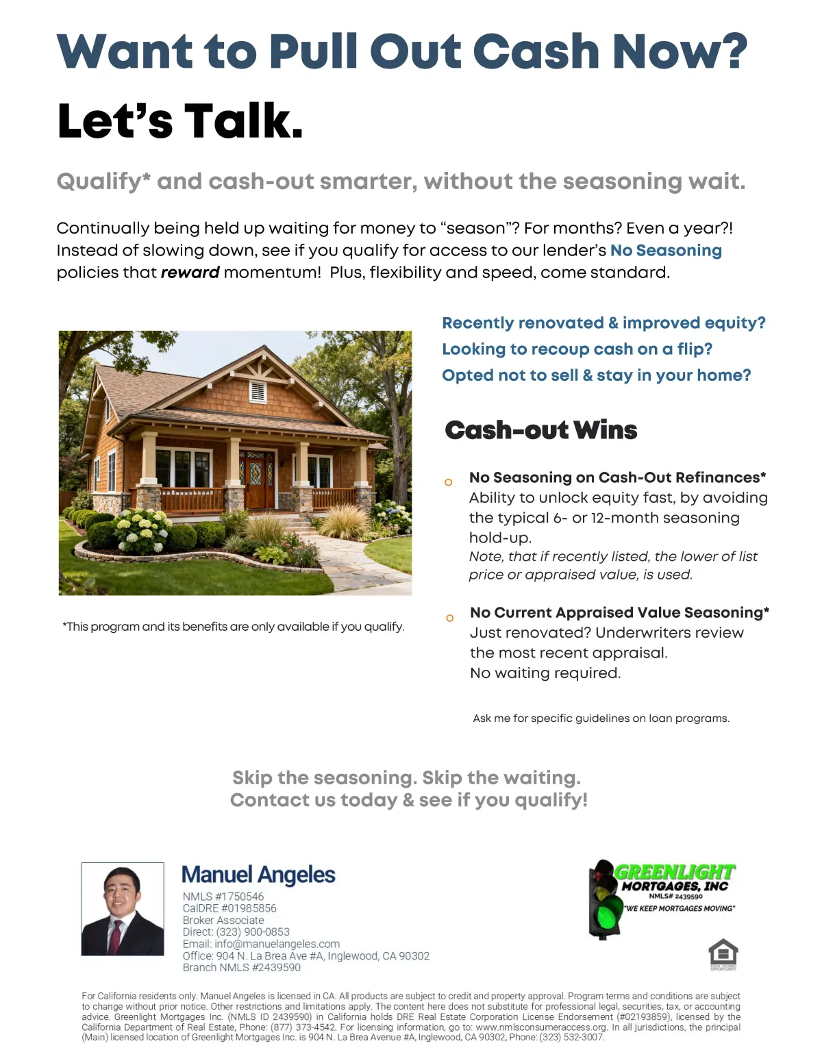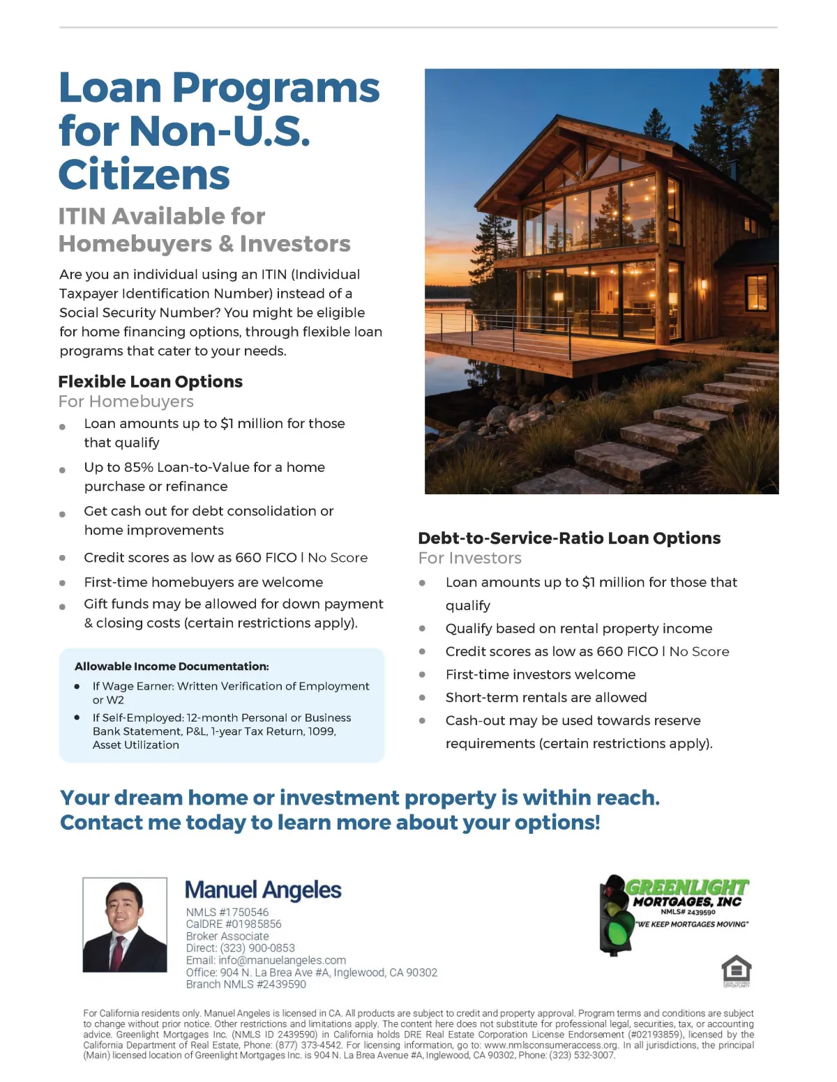 For California residents only. Manuel Angeles is licensed in CA. All products are subject to credit and property approval. Program terms and conditions are subject to change without prior notice. Other restrictions and limitations apply. The content here does not substitute for professional legal, securities, tax, or accounting advice. Greenlight Mortgages Inc. (NMLS ID 2439590) in California holds DRE Real Estate Corporation License Endorsement (#02193859), licensed by the California Department of Real Estate, Phone: (877) 373-4542. For licensing information, go to: www.nmlsconsumeraccess.org. In all jurisdictions, the principal (Main) licensed location of Greenlight Mortgages Inc. is 904 N. La Brea Avenue #C, Inglewood, CA 90302, Phone: (323) 532-3007. Non-owner-occupied business purpose investment residential and commercial property loans are available in AL, AR, CA, CO, CT, DE, DC, GA, HI, IL, IN, IA, KS, KY, LA, ME, MD, MA, MS, MO, NE, NH, NM, NY, OH, OK, PA, RI, SC, TX, VT, WA, WV, WI, WY.